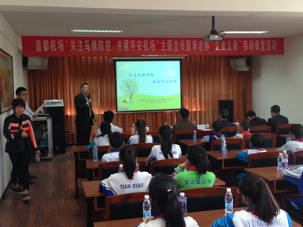 活動中,鄧先山向順義一中附小和裕達(dá)隆小學(xué)的學(xué)生代表頒發(fā)了“鳥擊防范小衛(wèi)士”榮譽(yù)稱號,贈送了鳥擊防范知識科普書籍,鼓勵(lì)同學(xué)們掌握科普知識,積極傳播正向的防鳥、驅(qū)鳥的安全理念。飛行區(qū)鳥擊防范模塊的青年員工積極向首都機(jī)場周邊學(xué)校宣講企業(yè)鳥擊防范安全理念,主動宣傳首都機(jī)場鳥擊防范重點(diǎn)工作、主要防范措施及科技創(chuàng)新內(nèi)容,通過幽默的語言講述,讓同學(xué)們在潛移默化中感知與學(xué)習(xí)。同時(shí),北京市野生動物救護(hù)中心金牌講解員帶領(lǐng)同學(xué)們實(shí)地參觀各種鳥類,并現(xiàn)場講解鳥類知識,此次移動課堂的授課方式贏得了老師和同學(xué)們的一致好評。