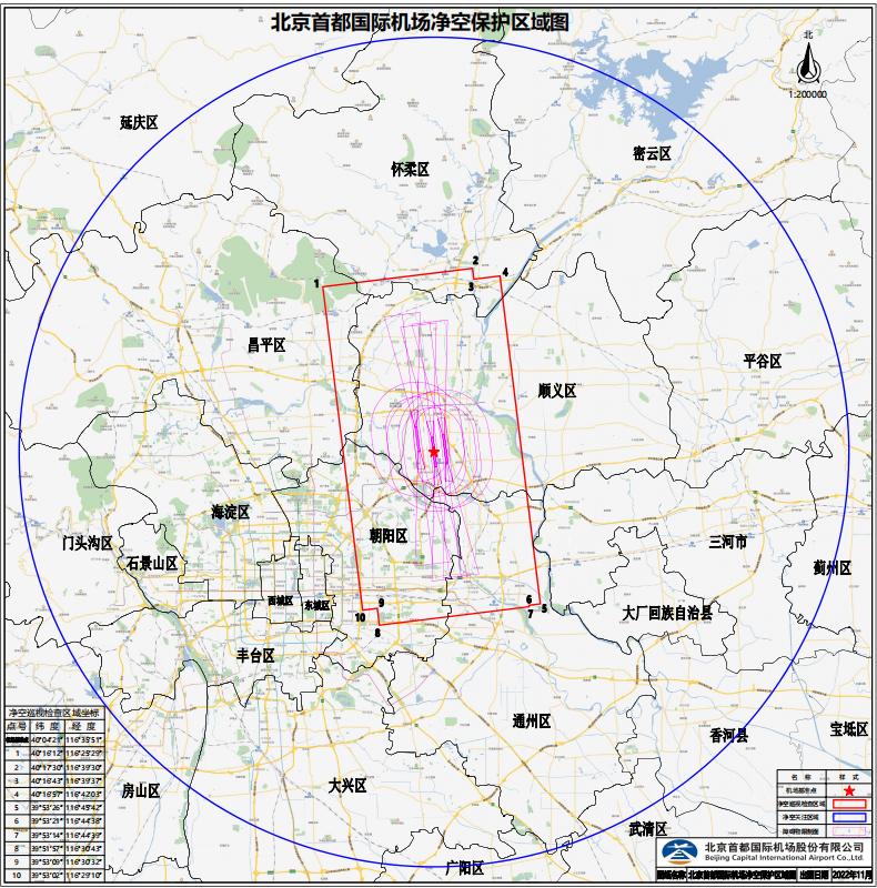 首都機(jī)場凈空重點保護(hù)區(qū)域(凈空巡視檢查區(qū)域)范圍為首都機(jī)場跑道中心線兩側(cè)各10公里、跑道端外各20公里以內(nèi)的區(qū)域,涉及順義區(qū)、朝陽區(qū)、通州區(qū)、昌平區(qū)及懷柔區(qū)部分區(qū)域,總面積約1050平方公里。