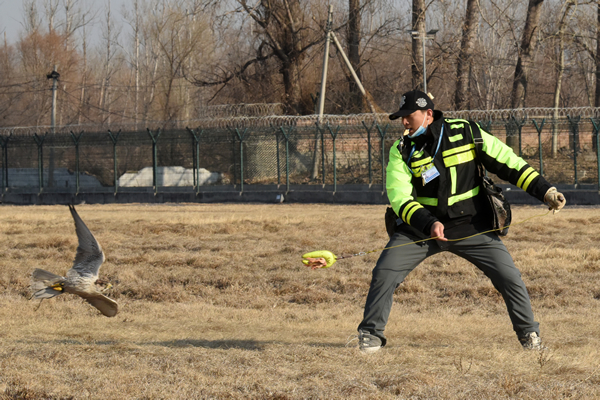 其中,針對機警的集群小型鳥類,首都機場在跑滑區(qū)域鳥網(wǎng)桿頂部增加了泛光飄帶、彩色風(fēng)輪等視覺設(shè)備進行干擾,同時組織人工驅(qū)鳥隊伍采取視覺、聽覺震懾驅(qū)趕等措施,避免鳥類逗留。而針對大型猛禽,首都機場則采用獵鷹驅(qū)鳥為主、“土方”捕捉為輔的方式,鷹舍獵鷹“傾巢而出”,“絆腳籠、鷹叉、鴿衣”等各種民間驅(qū)鳥方式各顯神通,收到了良好效果。