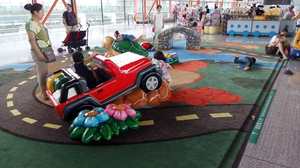 C09登機(jī)口兒童活動(dòng)區(qū)是以汽車(chē)為主題的活動(dòng)區(qū)域,區(qū)域內(nèi)卡通汽車(chē)、海龜分布錯(cuò)落有致,地毯上繪有卡通跑道圖案,整體風(fēng)格活潑、主題性突出。